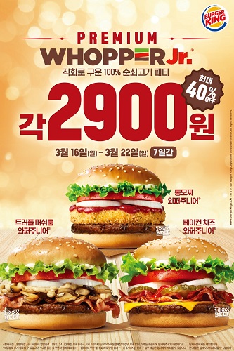 버거킹은 22일까지 프리미엄 와퍼주니어 3종을 각 2900원에 판매하는 프로모션을 진행한다고 16일 밝혔다.
