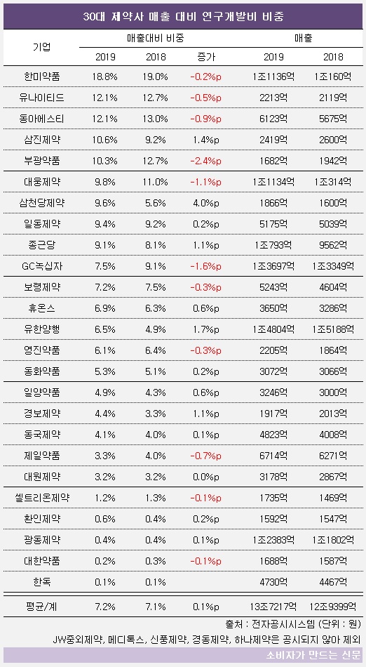 반면 셀트리온제약(대표 서정수)은 매출 대비 연구개발비 비중이 1.2%에 그쳤고, 환인제약(대표 이원범), 광동제약(대표 최성원), 대한약품(대표 이윤우), 한독(대표 김영진) 등은 1% 미만이었다.