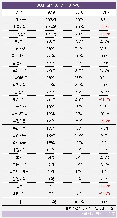한미약품(대표 우종수·권세창)이 연구개발비를 가장 많이 썼고 대웅제약(대표 전승호)과 GC녹십자(대표 허은철)도 1000억 원 이상을 투자했다.