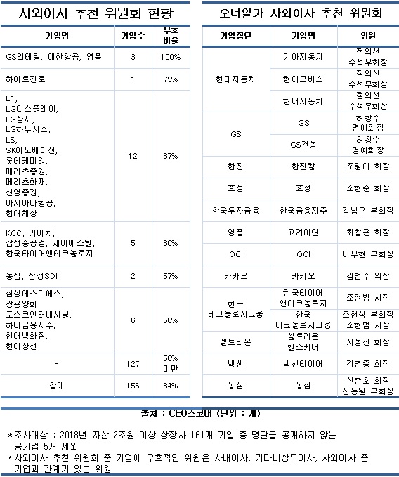 전체 사추위원의 3분의 1이 넘는 34%가 기업에 우호적인 인사인 것으로 조사됐고, 오너 일가가 위원장을 맡거나 위원에 포함된 기업도 16곳에 달했다.
