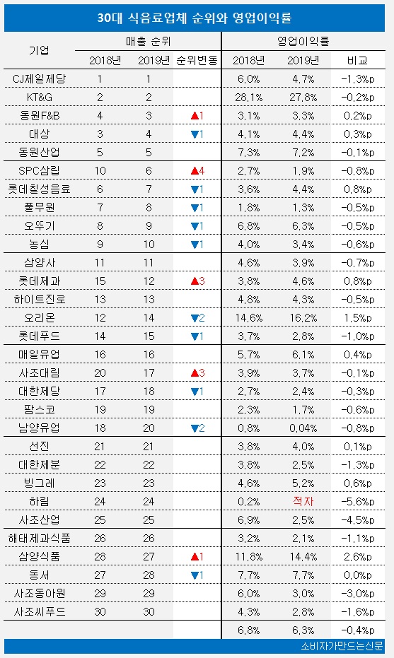 이 가운데 동원F&B가 대상을 밀어내고 매출 3위로 올라섰고, SPC삼립도 두자릿수 성장률을 보이며 4계단 높은 6위로 상승했다. 반면 풀무원과 오뚜기 등은 매출 순위가 1계단씩 하락했다.