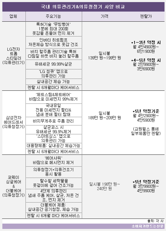 이들 제품의 가장 큰 차이점은 먼지를 제거하는 방식이다. 옷감을 흔들어 미세먼지를 제거하는 제품을 원한다면 LG전자를, 바람으로 의류 관리를 원한다면 삼성전자와 코웨이 제품을 선택하면 된다.
