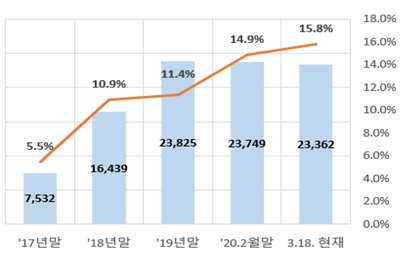P2P 대출 잔액도 작년 말 2조4000억 원에서 지난 18일 기준 2조3000억 원으로 2조 원대를 유지하고 있는 상황이다.