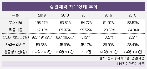 금융감독원 전자공시시스템에 따르면 삼일제약의 지난해 부채비율은 195.27%로 전년도 163.8%에 비해 12%포인트 가량 높아졌다. 통상 부채비율은 100% 미만을 건전한 것으로 보는데 삼일제약은 기준치의 2배 가까운 수준이다.
