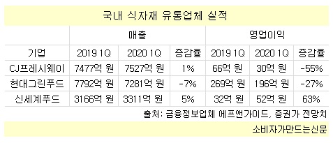 외식경기가 위축돼 식자재 수요가 급감하고 전국 학교의 개학 연기까지 맞물리며 급식사업마저 중단되자 CJ프레시웨이, 현대그린푸드 등 국내 식자재 유통업체의 실적 타격이 불가피 할 것으로 전망된다. 신세계푸드는 지난해 1분기보다는 영업이익이 늘었지만, 직전 분기보다는 매출과 영업이익이 모두 감소할 것으로 보인다.