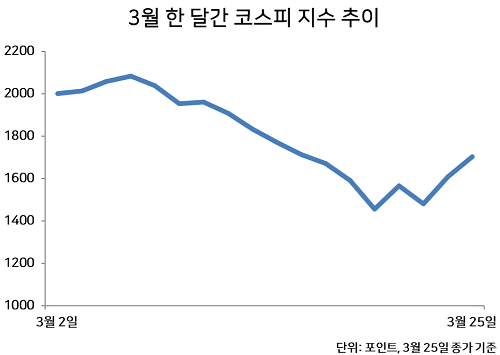 이후 지난 24일과 25일 양일간 미국의 무제한 양적완화 정책과 정부의 금융시장 안정화 방안발표 등의 호재에 힘입어 급반등에 성공해 25일 종가 기준 1704.76포인트로 마감하며 지난 16일 이후 다시 1700선을 회복했다.