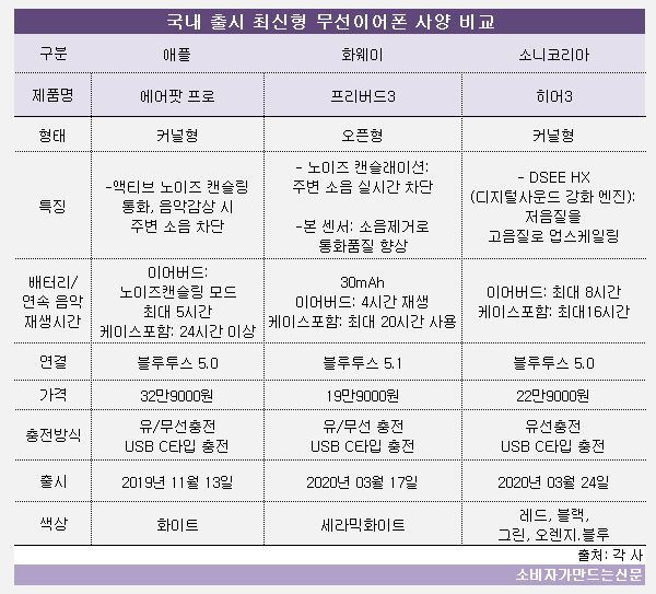 반면 화웨이 '프리버드3'의 이어버드 최대 사용시간은 1회 충전 시 4시간으로 가장 짧았다. 애플 '에어팟프로'는 5시간(노이즈캔슬링 모드), LG전자 '톤플러스 프리'는 6시간, 소니코리아 '히어3'는 8시간 사용 가능하다.