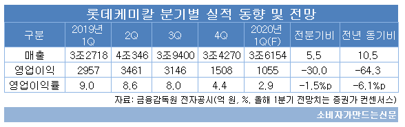 증권가에서도 롯데케미칼의 1분기 실적을 암울하게 점치고 있는 상태다. 키움증권은 롯데케미칼이 1분기에 영업이익 534억 원을 올릴 것으로 예상했다. 이는 전년동기비 85% 급감하는 것이다. 키움증권 이동욱 연구원은 "롯데케미칼의 올해 1분기 영업이익은 코로나 바이러스 확산과 대산 공장 사고에 따른 기회비용 발생으로 전 분기와 시장 기대치 대비 감소할 전망”이라고 말했다.