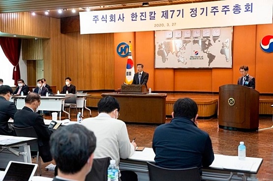 한편 이날 한진칼은 코로나19 예방 차원에서 주주를 제외한 외부인의 출입을 통제했지만 100명이 넘는 주주들이 찾아 문전성시를 이뤘다. 조원태 회장은 이날 주총에 참석하지 않아 석태수 한진칼 사장이 의장을 맡았다.