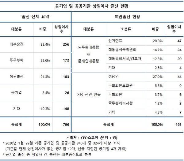 29일 기업평가사이트 CEO스코어(대표 박주근)가 올해 1월 말 기준 국내 340개 공공기관 중 324개 기관(기준일 현재 상임이사가 없는 공기업 12개, 신규 지정된 공기업 4개 제외)의 상임이사 766명을 전수 조사한 결과, 여권 출신이 163명으로 전체의 21.3%로 집계됐다.