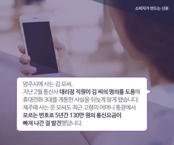 #2. 양주시에 사는 김 모씨. 지난 2월 통신사 대리점 직원이 김 씨의 명의를 도용해 휴대전화 3대를 개통한 사실을 뒤늦게 알게 됐습니다. 제주에 사는 문 모씨도 최근 고령의 어머니 통장에서 모르는 번호로 5년간 130만 원의 통신요금이 빠져 나간 걸 발견했답니다.