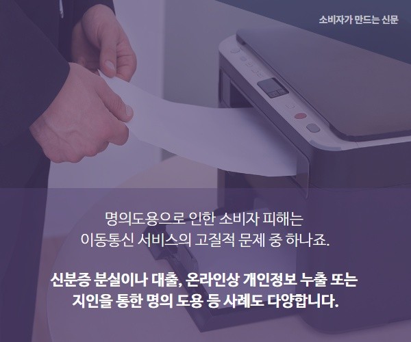 #3. 명의도용으로 인한 소비자 피해는 이동통신 서비스의 고질적 문제 중 하나죠. 신분증 분실이나 대출, 온라인상 개인정보 누출 또는 지인을 통한 명의 도용 등 사례도 다양합니다.