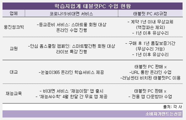 ◆ 태블릿PC 파손·분실 시 수업 진행 어려울 수 있어...약관 내용 챙겨야다만 업체별로 태블릿PC를 활용한 수업 방식은 조금씩 다르다. 태블릿PC를 제공하는 업체는 기기 AS 관련 별도 규정이 있으며 이 가운데 중도해지가 불가능한 상품도 있다.