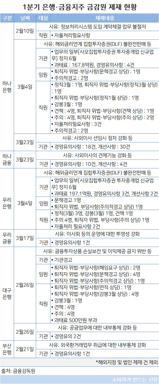 하나금융그룹의 경우 은행 3건, 금융지주 1건 등 총 4건의 제재를 받았고, 우리금융그룹은 은행과 금융지주가 각각 1건씩 2건의 제재를 받았다. 이밖에 대구은행이 2건, 부산은행이 1건의 제재를 기록했다.