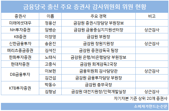 상임감사제도 대신 이사회 내 사외이사로 구성된 감사위원회를 운영하는 다수 증권사 중에서도 감사위원 중 일부는 금감원 출신 인사다.