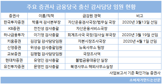 상임감사를 두지 않은 상당수 증권사들은 감사업무를 담당하는 본부장급 임원을 금융당국 출신 인사로 선임하고 있었다.
