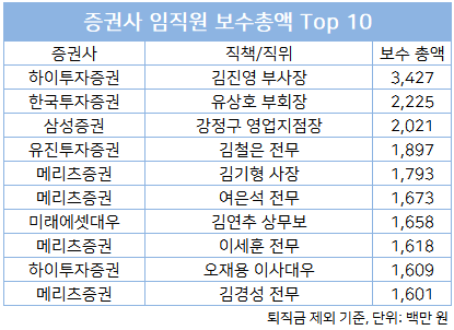 금융감독원 전자공시시스템에 따르면 지난해 김진영 하이투자증권 부사장은 급여와 성과급을 포함해 34억2700만 원을 수령해 전체 증권사 임직원 중에서 가장 많은 보수를 받았다.
