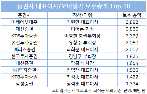 대표이사 및 오너 일가 중에서는 최현만 미래에셋대우 대표이사(수석부회장)가 보수 총액 28억9200만 원으로 가장 많이 받았다. 최 수석부회장은 급여가 15억3800만 원, 상여금이 13억5200만 원으로 급여가 더 많았다.