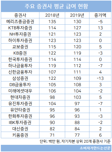 한편 자기자본 상위 20개 증권사 중에서 지난해 직원 평균 급여가 가장 많은 증권사는 메리츠종금증권으로 1억3000만 원이었다. KTB투자증권이 1억2700만 원, NH투자증권과 하이투자증권이 1억2300만 원을 뒤를 이었다. 이들 증권사는 성과급이 상대적으로 많은 사업부문인 IB 수익 비중이 높은 증권사라는 점이 반영된 결과로 보고 있다.