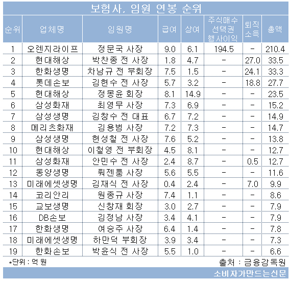 동양생명 뤄젠룽 사장은 11억6000만 원, 코리안리 원종규 사장은 8억6000만 원, DB손해보험 김정남 사장 7억9000만 원, 한화생명 여승주 사장 7억8000만 원, 미래에셋생명 하만덕 부회장은 7억3000만 원 순이었다.