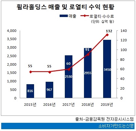 금융감독원 전자공시시스템에 따르면 휠라홀딩스의 지난해 매출은 3조4500억 원으로 이중 로열티와 수수료 매출이 1320억 원을 차지한다.