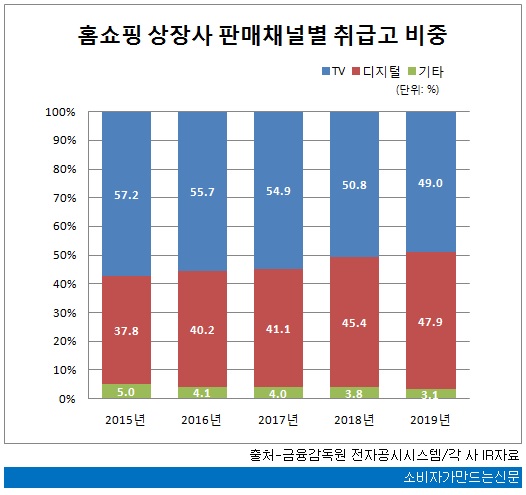 디지털 채널 취급고는 모바일로 변해가는 쇼핑 환경과 홈쇼핑사들이 모바일로 구매시 혜택 제공 등 프로모션을 활발히 펼치며 비중이 꾸준하게 확대됐다.