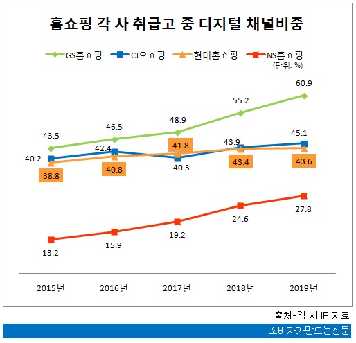 NS홈쇼핑도 3사에 비해서는 적은 수준이지만 디지털취급고 비중이 매년 꾸준히 늘고 있다. 2018년 20%를 돌파한 후 지난해는 3774억 원으로 27.8%까지 확대됐다.