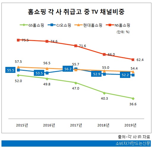 GS홈쇼핑(대표 김호성)은 모바일 채널 비중이 60%를 돌파하면서 TV채널 비중이 절반 밑으로 떨어졌고 CJ ENM 오쇼핑부문(대표 허민호)과 현대홈쇼핑(대표 정교선, 강찬석)도 40%를 훌쩍 넘어섰다. NS홈쇼핑(대표 도상철)도 30%에 다다르며 주요 홈쇼핑사에서 디지털 채널의 취급고 비중이 확대되는 모습이다.
