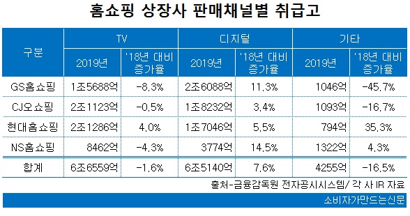 GS홈쇼핑과 CJ오쇼핑, 현대홈쇼핑, NS홈쇼핑 등 4개 상장사의 지난해 총 취급고는 13조6000억 원으로 전년(13조3000억 원)보다 2% 증가했다.
