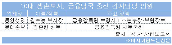 사업보고서를 기준으로 살핀 결과, 국내 10대 생명보험사와 10대 손해보험사 가운데 총 5곳이 6명의 금융당국 출신 감사위원을 선임한 것으로 나타났다. 감사 총괄 임원까지 포함하면 7개사에 8명으로 늘어난다.