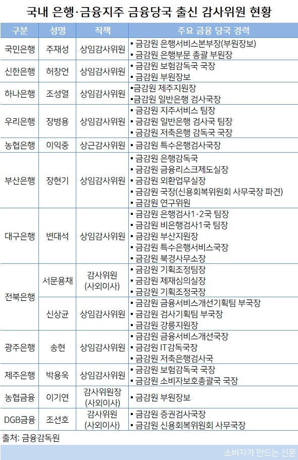 이밖에 △하나은행(조성열 상임감사위원) △우리은행(장병용 상임감사위원) △농협은행(이익중 상근감사위원) △부산은행(장현기 상임감사위원) △대구은행(변대석 상임감사위원) △광주은행(송현 상임감사위원) △제주은행(박용욱 상임감사위원)이 감사위원회 위원에 금감원 출신을 선임한 것으로 확인됐다.