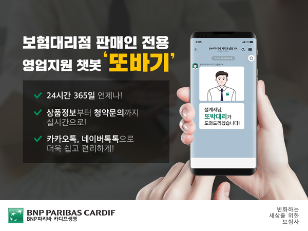 ‘또바기’는 ‘언제나 한결같이 꼭 그렇게’라는 의미의 순우리말로, BNP파리바 카디프생명 제휴 GA 판매인들의 영업활동을 지원하는 챗봇 서비스이다.
