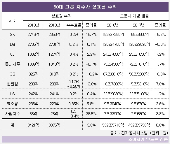 ㈜CJ와 롯데지주도 지난해 1000억 원 이상의 상표권 수익을 올렸다.