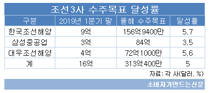 현대중공업, 현대미포조선, 현대삼호중공업을 포함하는 한국조선해양(대표 가삼현)과 삼성중공업(대표 남준우), 대우조선해양(대표 이성근) 등 조선3사의 올해 1분기 말 기준 수주액은 16억 달러에 그쳤다. 연간 수주목표의 고작 5% 수준에 그쳐 올해 목표 달성이 쉽지 않을 것으로 보인다. .