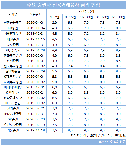 현재 증권사 신용거래융자 금리는 기간별로 3.9%에서 11%까지 다양하게 분포돼 있다. 최단기간인 1~7일 기준으로 신한금융투자가 3.9%로 가장 낮고 케이프투자증권이 8.5%로 격차는 2배 이상이었다. 다만 케이프투자증권은 전 구간 단일금리로 책정해 오히려 기간이 길수록 실질적으로 금리가 떨어지는 효과가 있었다.