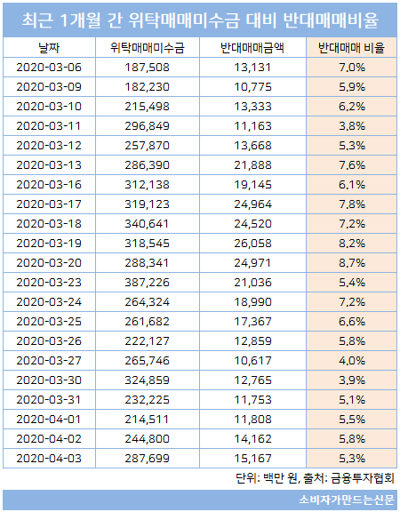 최근 1달 간 투자자가 결제대금이 부족해 증권사에서 부족한 대금을 대신 결제해준 '위탁매매미수금' 규모는 일평균 2000~3000억 원, 이 중 미수금을 갚지 못해 발생한 반대매매 규모도 일평균 100~200억 원대를 상회했다.