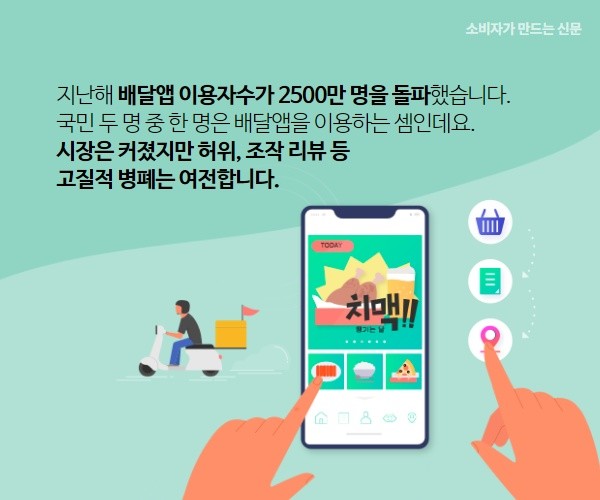 #2. 지난해 배달앱 이용자수가 2500만 명을 돌파했습니다. 국민 두 명 중 한 명은 배달앱을 이용하는 셈인데요. 시장은 커졌지만 허위, 조작 리뷰 등 고질적 병폐는 여전합니다.