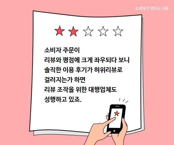 #3. 소비자 주문이 리뷰와 평점에 크게 좌우되다 보니 솔직한 이용 후기가 허위리뷰로 걸러지는가 하면 리뷰 조작을 위한 대행업체도 성행하고 있죠.
