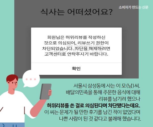 #4. 서울시 삼성동에 사는 이 모(남)씨. 배달의민족을 통해 주문한 음식에 대해 리뷰를 남기려 했으나 허위리뷰를 쓴 걸로 의심된다며 차단됐다는데요. 이 씨는 문제가 될 만한 후기를 남긴 적이 없었다며 나쁜 사람이 된 것 같다고 불쾌해 했습니다.