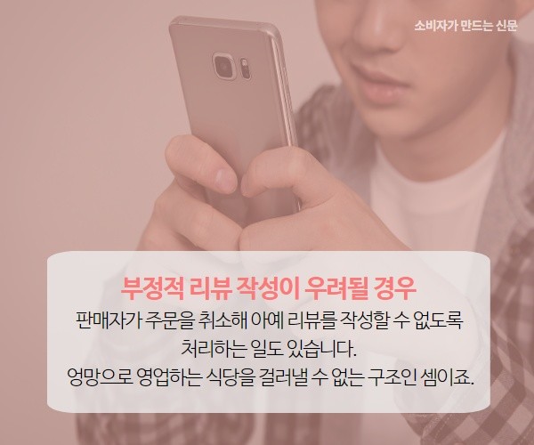 #5. 부정적 리뷰 작성이 우려될 경우 판매자가 주문을 취소해 아예 리뷰를 작성할 수 없도록 처리하는 일도 있습니다. 엉망으로 영업하는 식당을 걸러낼 수 없는 구조인 셈이죠.