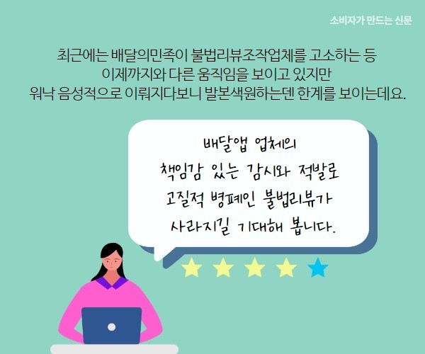#7. 최근에는 배달의민족이 불법리뷰조작업체를 고소하는 등 이제까지와 다른 움직임을 보이고 있지만 워낙 음성적으로 이뤄지다보니 발본색원하는덴 한계를 보이는데요. 배달앱 업체의 책임감 있는 감시와 적발로 고질적 병폐인 불법리뷰가 사라지길 기대해 봅니다.