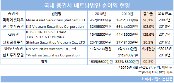 신한금융투자 베트남법인도 순이익이 같은 기간 20.2% 증가한 27억8100만 원으로 순항했고 지난 2018년 법인이 설립된 NH투자증권은 지난해 흑자전환에 성공하며 향후 성장 발판을 마련했다.