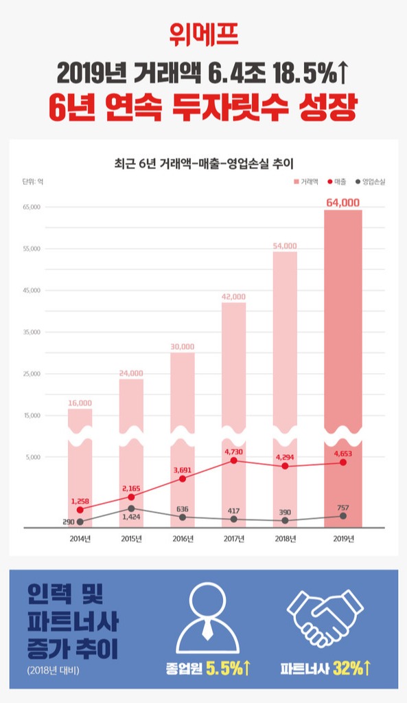 위메프는 2019년 실적 집계 결과 연간 거래액 6조4000억 원을 기록했다고 8일 밝혔다. 매출과 영업손실은 각각 4653억 원, 757억 원이다.