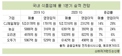 금융정보업체 에프앤가이드에 따르면 국내 최대 식품기업인 CJ제일제당은 1분기에 매출 5조7216억 원, 영업이익 2312억 원을 거둘 것으로 추정된다. 전년 동기에 비해 매출은 14%, 영업이익은 29% 증가한 수치다. 코로나19사태로 B2B(기업간거래)를 기반으로 하는 장류와 조미료 등의 매출은 부진했지만 햇반‧컵밥‧가정간편식 등 매출이 상승했다.