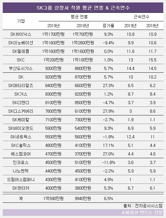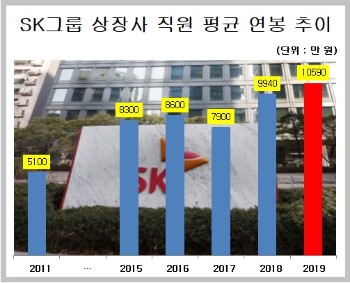 SK 상장사 직원 평균 연봉이 1억 원을 넘어선 것은 이번이 처음이다. 2000년대 초반 5100만 원이던 직원 평균 연봉은 2016년 8600만 원으로 올랐고, 2018년에는 9940만 원을 기록했다.