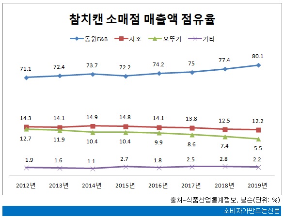 업체별로는 동원F&B가 점유율을 77.4%에서 80.1%로 끌어올리며 1위 자리를 더욱 공고히 했다. 동원F&B가 사업보고서를 내기 시작한 지난 2000년 70.4%를 기록한 후 70%대에 머무르다 지난해 80%를 넘어섰다.
