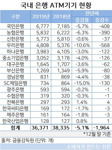 은행 자동화기기 수는 매년 꾸준히 줄어들고 있지만 감소 폭은 차츰 둔화되는 추세다. 전년 같은 기간 국내 은행의 ATM기기 숫자는 2260개(5.6%) 감소한 바 있다.