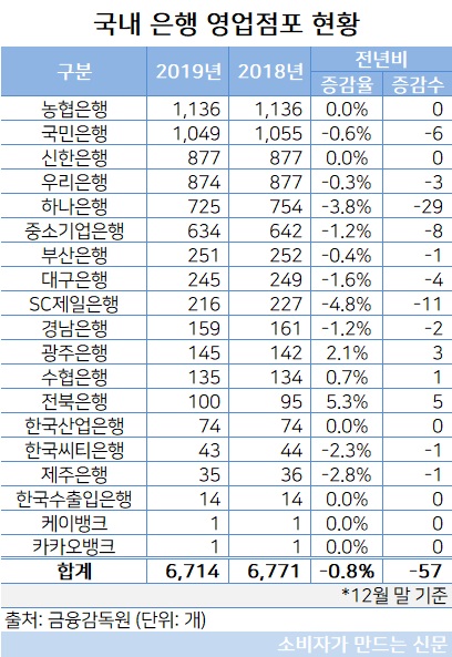 지난해 국내 은행의 영업점포 수는 6714개로 전년(6771개) 대비 57개(0.8%) 감소했다.