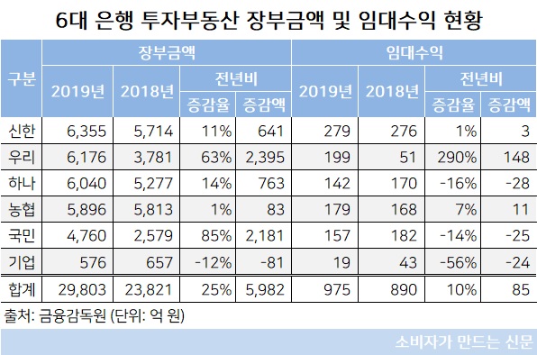 금융감독원에 따르면 지난해 6대 은행의 투자부동산 장부금액은 2조9803억 원으로 전년 대비 5982억 원, 비율로는 25%나 늘었다. 투자부동산 임대수익 총액은 975억 원으로 전년 대비 10% 증가했다.