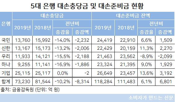 지난 1년간 5대 은행의 대손충당금은 7조3230억 원으로 전년 대비 10.2%(8314억 원) 줄어든 반면 대손준비금은 6801억 원이 증가한 11조8284억 원으로 집계됐다.